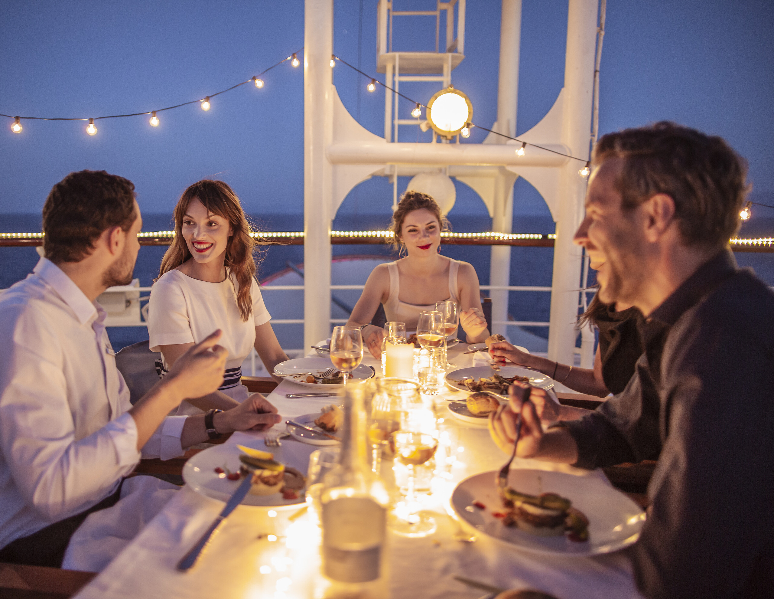 - 3 Abendessen mit persönlicher Kreation, die zweimal während der Kreuzfahrt wiederholt werden, damit alle Passagiere 3 Abende genießen können (muss gebucht werden): 1 Amuse-Bouche, 1 Vorspeise, 1 Hauptgericht und 1 Dessert.